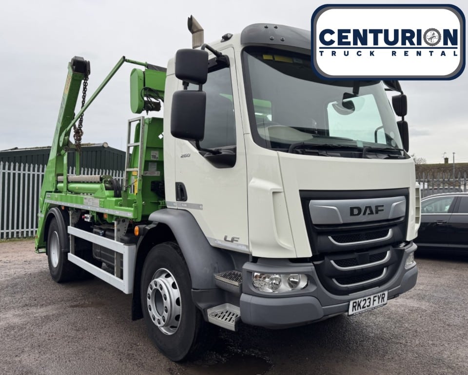 2023 (23) DAF LF260 FA 18 Tonne Hyva Body Skip Loader (Choice of 3), 6690cc diesel engine with a 6-speed manual gearbox, Air conditioning, Reversing camera, Cruise control with speed limiter, Electric side mirrors and windows, Hyva body with telescopic arms, Electric easy sheet, Euro 6, 2- seats with a cloth interior, Bluetooth connectivity with handsfree calling and steering wheel controls. CHOICE OF THREE.